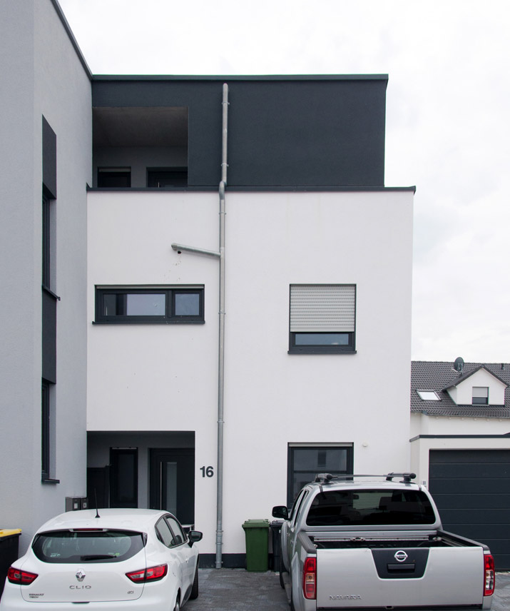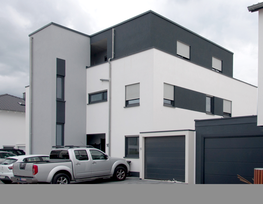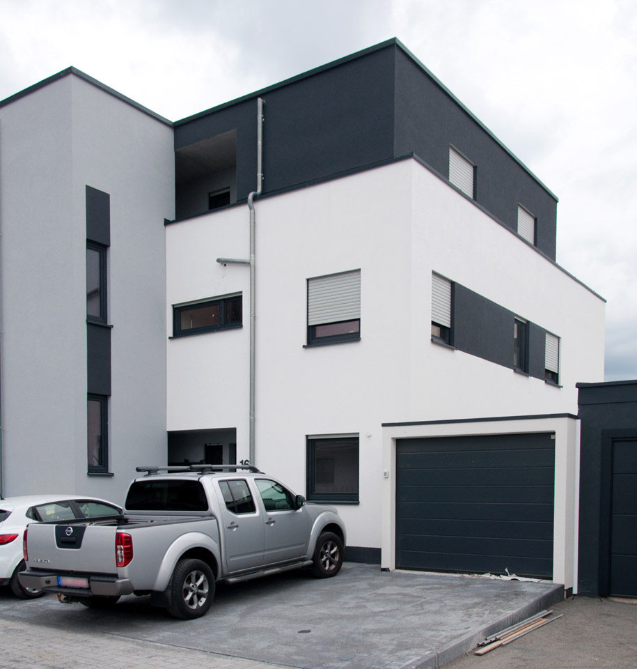 Neubau einer mehrstöckigen modernen Doppelhaushälfte mit Stellplätzen.