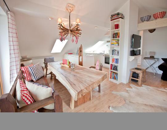 Mit dem Alpinen Chalet 1 erwartet den Feriengast eine exklusive 5 Sterne Ferienwohnung auf zwei Etagen. Die Wohnung wurde kernsaniert und komplett umgestaltet. Mit seinen 134 m² für 5 Personen bietet das Alpine Chalet 1 ein großes Wellness-Bad mit Sauna und Wirlwanne und ein großes Wohn-Esszimmer mit offener Küche. Die Kombination aus Holz, Tierhäuten und Geweihen verleiht dem Chalet eine rustikale und alpine Atmosphäre, die durch weiße Wandanstriche und durchdachte Beleuchtung zugleich hell und sehr einladend wirkt.